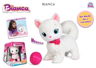 - Bianca is a sweet, soft and lovely kitten who loves to play with you and her little ball. Behave like a real kitten: turn your head when you call it, crouch when you caress the back, play with your little ball while humming a sweet melody and more. Do not touch his duck, he does not like it too much. Comes with a ball of wool as an accessory, Place him in front of her and start walking to play. Always try to get your attention for caresses and play.