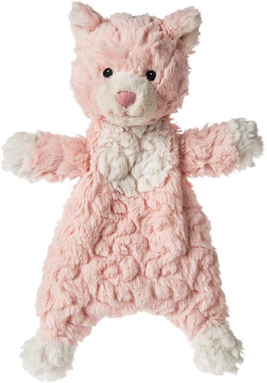 SOFT KITTY LOVEY: Putty Kitty is a comforting, huggable cuddle toy of super-soft, etched fabrics in blush pink and white, perky-eared cutie has embroidered eyes for total softness