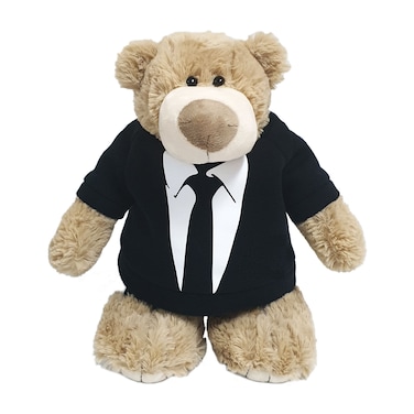 Supersoft, cuddly cream bear with trendy black suit. Ideal for Fathers Day, Thank You Teacher's Gift or first day at work. Suitable for boys and adults. Size 28cm