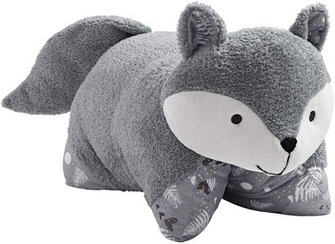 Perfect plush: bring your favorite animal home in the form of a pillow pet! This naturally comfy fox features a Gray and white fox with a patterned underside with trees, hearts, and gold Dots.