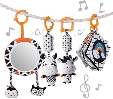 All in one early development toys: the tummy mirror attract baby to focus on a human face, preferred from birth. Design with cute animals for grasp and teething.The animal wind chime and crinkle cloth book, which makes a soft soothing sound by gentle shake or squeeze it, that cultivates baby hearing and touch development.Good for baby motor skills development.it enhances the fun when parents play with babies, help stimulate your babies infant to learn grab things.