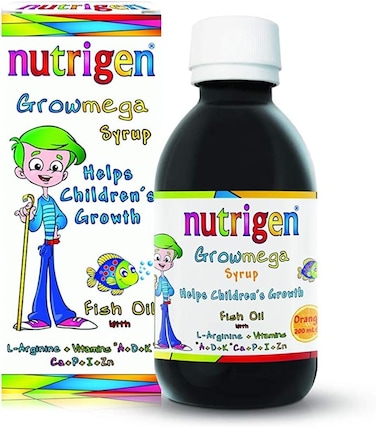 Nutrigen Growmega Syrup is fish-oil syrup enriched with vitamins and minerals to support the healthy growth and development of children. The unique composition of Nutrigen Growmega Syrup contributes to maintenance of normal development of bones, teeth and normal muscle function. When bones and all related tissues develop in accordance, children have stronger skeletal system and have longer height. Nutrigen Fish Oil Syrup is different from all known conventional fish oil syrups not only in its composition and taste but also in the fish oil content. The fish oil EPA and DHA fatty acids, zinc, L-arginine and vitamins K and D are the essential nutritional factors to promote the development of bone structure and height growth in children. The main problem with the children in taking fish oil syrup is its taste that mostly makes them to refuse to drink. Now Nutrigen Fish Oil Syrup with its starch encapsulated fish oil offers amazingly tasting good syrup in fresh orange juice.