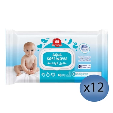 Carrefour Aqua Soft Wipes Family Pack White 60 Wipes Pack of 12