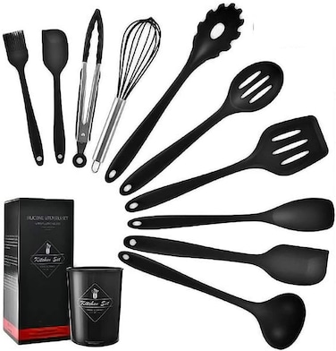 11 Pcs Silicone Kitchen Utensils Set Heat Resistant Cooking Tools for Non Stick Cookware Easy to Clean Kitchen Baking Kit with Holder, Black
