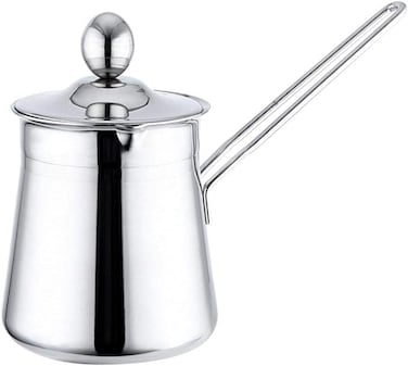 A versatile stainless steel decanter ideal for Turkish coffee, warming milk, melting butter, and more. Features a handle for easy use and a lid, with a 350ml capacity.