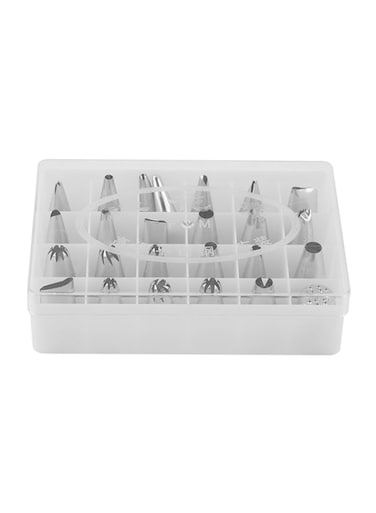 - <li>24 differently ended icing nozzlesFit for profession use or home useWonderful tools for bakery and baker etc<li>Easy to use and clean<li>Reusable, non-stick<li>Compact and lightweight design accounts for easy storage</br></br><li>Colour Name : Silver<li>Material : Stainless Steel<li>Model Number : ZK369700