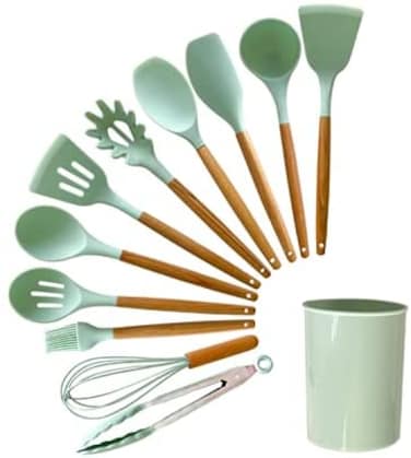 Contains Essential Spoons and Spatulas: This 11-piece might seem a bit basic at first. The set contains all the essential silicone kitchen tools which most people need to get food prepared. Another bonus is the fact that they are durable spatulas. This cooking collection comprises slotted spoon, solid spoon, soup ladle, solid turner, slotted turner, spatula, pasta server, whisk, tongs, basting brush, and round spatula