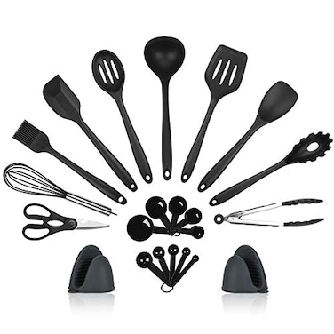 - A Quality Investment for Any Kitchen With our premium 22-piece utensil set, the variety of kitchen tools ensures any cook has exactly what is needed at hand for the perfect meal every time.Unlike cheaper kitchen gadget sets that break or melt after a few uses, our 22-piece premium quality kitchen gadgets are the must-have cooking accessories for the well-equipped kitchen.Stylish & Sophisticated Look Your kitchen will feel gourmet when you re cooking with these sleek, refined kitchen accessories set.The chic black silicone looks gorgeous and they easy to grip, comfortable handles and balanced weight make a nimble job of your entire kitchen mixing and flipping.Tired of your expensive non-stick cookware getting destroyed by stainless steel spatulas Or of old plastic cooking utensils melt and break easily SURNORME non-scratch kitchen utensil set can handle any type of cooking while being gentle on your pan and pot.They won't bend or break when you turn your meat or mix a salad.SURNORME kitchen utensils are designed with unique ergonomic grips, and their slip-resistant coating provides a firm, comfortable grip and prevents slippage while cooking. ( ) 22 PIECES SILICONE KITCHEN UTENSIL SET - FALL IN LOVE WITH COOKING ALL OVER AGAIN ( )