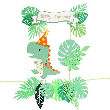 1 × green dinosaur topper 1 × pink dinosaur topper 2 × happy birthday banner 2 × long flag topper 16 × green palm leaf toppers