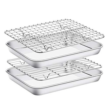 • <p>(4PCS Bakeware Set)Estmoon 4pcs baking sheet with wire rack set including 2 baking sheets 9 x 7 x 1 inch, 1 dense grid cooling rack and 1 square row baking rack 9 x 7 x 0.67 inch. The bakeware set fits most regular oven and toaster oven. Our stainless steel baking sheet pan and cooling rack are designed to work perfectly together and superbly apart. (Healthy Material)This baking rack and sheet pans for cooking are made of high quality stainless steel without any chemical coating and wouldn't create chemicals at high-temperature baking, rust resistant and durable for many years. <p>A perfect gift for favorite home chef! (Superior Design & Heavy Duty)Thick gauge baking tray with sturdy construction, the baking rack welded firmly, lifts food above juices to allow hot air evenly circulate and bake, oven-safe up to 575 F, effectively prevent baking and cooling racks from bending or warping. This baking sheet with rack has superior mirror polished finish to reduce the risk of food sticking, and smooth roll rims make it comfortable to hold. (Food Heated Evenly)Toaster oven pans perfect for baking bacon, crispy chicken, bread, pastries, cookies, brownies, fruit cobblers making, cooling cookies and cakes and draining water and oil. (Easy to Clean)1 inch deep edges of the baking pan avoid food juice food on the oven rack flowing everywhere, keeping your oven neat. Dishwasher safe to save your labor. If you receive cracked products or you are not 100% satisfied with our products, please feel free to contact our customer service.