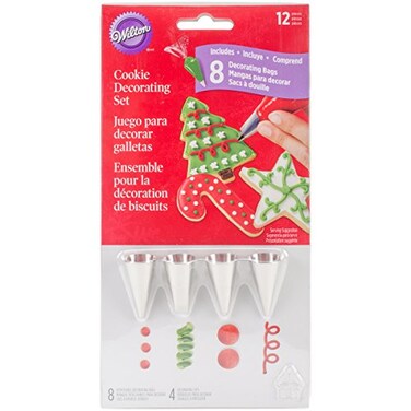 Product Description Wilton Cookie Decorating Set discover how much fun cookie decorating can be. This package contains eight 12 inch disposable decorating bags, four assorted decorating tips and 8 pipping/decorating bags. Set Contains: 4 x tips8 x decorating bags