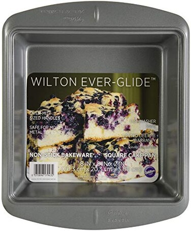 Wilton Ever-Glide Square Pan, 8 x 2in. Premium nonstick cake pan to bake perfect sheet cakes, brownies, etc. This square cake pan is great for baking brownies, bar cookies, and small cakes. The handles are embossed with the pan dimensions for easy reference and their larger size gives you a better grip when going in and out of the oven. Dishwasher safe. Limited lifetime warranty. Wilton bakeware is dishwasher safe. However, for best results hand wash in warm, soapy water before first and after each use. Rinse and towel dry. We recommend using only those products which are labeled "safe for cleaning non-stick surfaces." Do not use dishwasher detergent tablets, the concentrated cleansers will damage the finish. Avoid cleaning with abrasive cleansers or scouring pads. Do not use sharp or serrated metal utensils, as they may cut through the non-stick coating. Some foods may stain metal but will not affect the performance. Material: Heavy weight steel with premium nonstick coating.