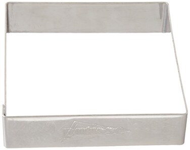 European design bakeware accessories. One set of 4 square-shaped tart rings. Each ring measures 3 1/8 inches by 3 1/8 inches, and is 3/4 of an inch high. Made of double rolled stainless steel.