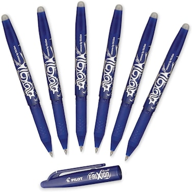 - <p>Pack of 6 fine point pens with blue ink<p>Erase and rewrite repeatedly without damaging documents - Eraser is at the top of the pen<p>Unique Thermo-Sensitive gel ink formula disappears with erasing friction<p>Retractable and refillable - FriXion refill model sold separately<p>15.49 x 4.32 x 1.27 cm, 9.07 Grams<p>