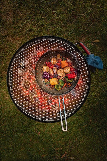 Enameled steel body and lid. Stainless steel charcoal tray. Durable rubber wheels