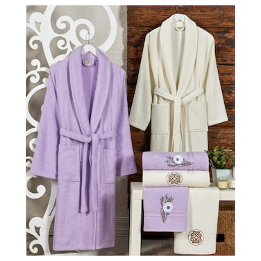 6-Piece Turkish Velour Cotton Couple Bathrobe and Towel Set Lilac/Ivory
