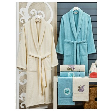 My Vita 6-Piece Turkish Cotton Family Bathrobe Set Bridal Shower Gift Set With Matching Bath Towels And Hand Towels In Attractive Gift Box - Cyan/Off White