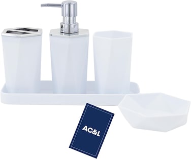 AC&L Bathroom Accessories Set, 5 Pcs Plastic Bathroom Counter Vanity Set, Liquid Soap Dispenser, Toothbrush Holder, Soap Dish, Q tips Tumbler, Vanity Tray, Modern Bathroom Decor Organizer (White)