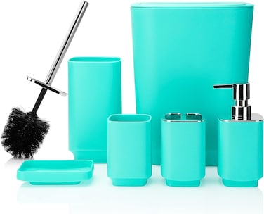 Bathroom Accessories Set of 6 Modern Design 6 Pieces Bathroom Accessory Set Soap Dispenser Toothbrush Holder Tooth Mug Soap Dish Toilet Brush Rubbish for Bathroom Home Decor (Teal)