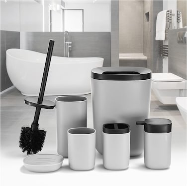 Bathroom Accessories Set of 6 Unique Design 6 Pieces Bathroom Accessory Set Soap Dispenser Toothbrush Holder Tooth Mug Soap Dish Toilet Brush Rubbish for Bathroom Home Decor (Grey)