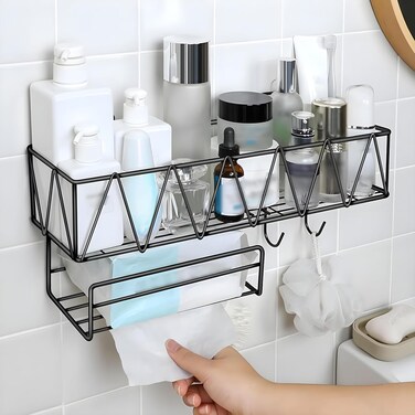 Cozy Nest Floating Shower Caddy Self-Organizer with Tissue Holder and Hooks,No-Drilling Rustproof Iron Wall-Mounted Cosmetic Storage Shelves for Toilet Kitchen