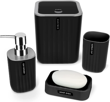Generic Bathroom Accessory Set - 4 Piece Bathroom Accessories Set with Trash Can, Soap Dish, Soap Dispenser, Toothbrush Cup, Bathroom Decor Sets With Desktop Small Trash Can - Black Stripe