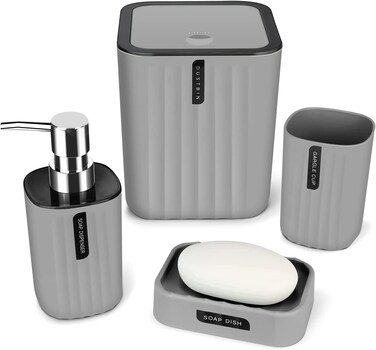 Generic Bathroom Accessory Set - 4 Piece Grey Bathroom Accessories Set With Trash Can, Soap Dish, Soap Dispenser, Toothbrush Cup, Bathroom Decor Sets With Desktop Small Trash Can - Grey Stripe