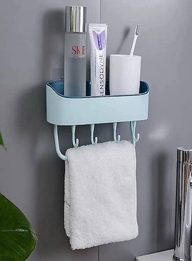 Unique design with hooks that allow you to hang your wet towel, sponge, headband, and so on.Bathroom shelf can store in vanity tops, suitable for narrow space and convenient to store shampoo, conditioner, and soap, etc.