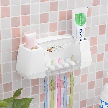 Designed with 5 slots and 2 cups, this versatile holder is perfect for storing your toothbrushes and toothpaste.