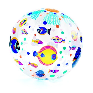 A large fish-themed balloon ball that is ideal for outdoor or water play on the beach or pool.