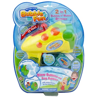 - Bubble Fun 2 in 1 Bubble n Water Blaster blows bubbles and shoots water... The bubbles can be blown then popped by the blaster. Great outdoor fun to be had, water can be squirted over 15 feet!