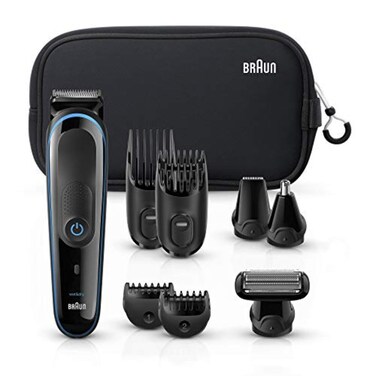 Braun All-in-one trimmer MGK3980, 9-in-1 Beard Trimmer, Hair Clipper, Ear and Nose Trimmer, Body Groomer, Detail Trimmer, Rechargeable, with Gillette ProGlide Razor, Black/Blue