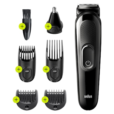 The Braun 6-In-1 Rechargeable Trimmer MGK 3220 Black is a versatile grooming tool that offers six different functions in one device.