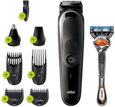 Braun trimmer MGK5260, 8-in-1 trimmer, Beard, Body & hair clipper 6 attachments and Gillette Fusion5 ProGlide razor.