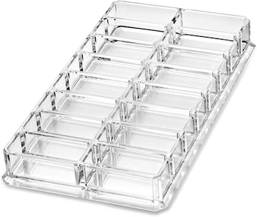 - <p>Color:16 display places<p>Made From a Single Mold of Pure Crystalline Acrylic<p>16 spaces for standard sized eyeshadows<p>Made from a single mold with no glued pieces<p>Designed with beveled edges resulting in no sharp edges<p>Made with pure crystalline acrylic mimicking the look of glass<p>Designed with a bottom flared edge for style and added stability<p>The Wall Height Allows For Stability Yet a Clear View of Your Products<p>Fits standard sized eye shadows<p>The increased wall height allows for stability when moving<p>Fits in most drawers<p>Dimensions & Weight<p>Standard: 21.811.92.6cm.<p>MULTIUSE TRAY: With 16 separate compartments, you can store various items in this organizer.<p>ELIMINATE CLUTTER: Makeup can often be bulky and take up a lot of space. While makeup bags and carrying cases are great, they often lack multiple storage compartments.<p>VERSATILE & STYLISH MAKEUP HOLDER: Because this organizer is clear, it matches any home decor. Measuring 21.811.92.6cm.<p>EASY TO CLEAN MAKEUP TRAY: Acrylic is a great choice for this organizer because it has a clear finish like glass but is durable and shatter resistant.<p>ACRYLIC MAKEUP ORGANIZER: Keep your eyeshadow neat and at your fingertips with this organizer. With several compartments inside designed to fit 16 smaller compacts or beauty care products.