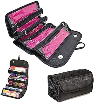 Generic Makeup Bag Cosmetic Hanging Organizer Roll N Go Roll Up Foldable Clear Case Pouch Toiletry Organizer Multifunction Large Capacity For Cosmetics, Jewelry, Travel Accessories, Electronics(Black)