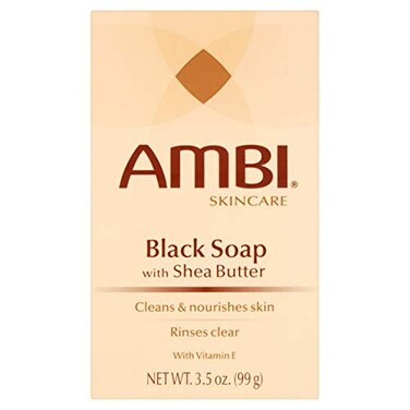 Ambi skin care black soap with shea butter facial bar Cleans and nourishes skin and also rinses clear with vitamin E. Enriched with Shea butter. Aloe Vera and Vitamin E. It leaves skinnaturally nourished, soft and smooth, and rinses clear.