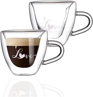 - • This beautiful coffee or tea glasses comes in a Heart design with "Love" Logo is nice choice for you to hold most kinds of beverages, such as coffee, milk, espresso, tea, juice and so on, fill the cup and show the shape of love. GREAT GIFT for all occasions .