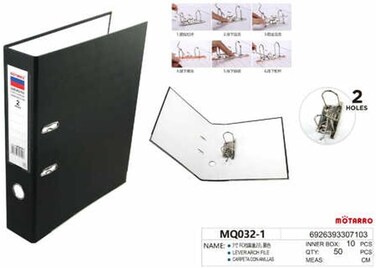 Motarro MQ032-1 FC Loose Leaf Binding Lever Arch File is a high-quality lever arch file designed to organize and store FC-sized loose-leaf documents, reports, or paperwork. It features a sturdy construction with a durable cover and spine for long-lasting use and protection of contents. The file includes a lever mechanism for easy opening and closing, allowing for quick access to documents. Additionally, it has a spine label holder for easy identification and organization on shelves or in storage cabinets, making it ideal for efficient document management in offices, businesses, schools, or home offices. It comes in 2-piece set with black color.