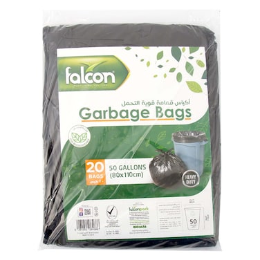 Keep your space clean and tidy with the Falcon Heavy Duty Garbage Bags. These black bags are designed to handle heavy loads, making them perfect for use in commercial or industrial settings. With a capacity of 50 gallons, they can hold a large amount of waste, reducing the need for frequent bag changes. Measuring 80x110cm, they provide ample space for even the bulkiest items. This pack includes 20 bags, so you'll have plenty on hand for all your garbage disposal needs. Trust Falcon for durable and reliable garbage bags.