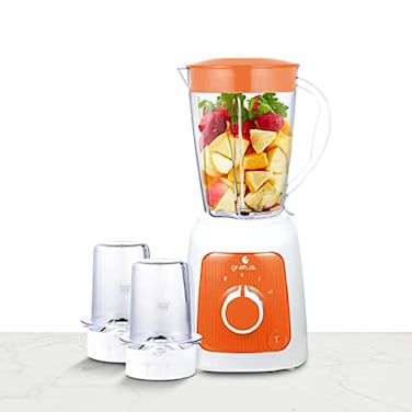 GRATUS presents a powerful low noise 3 in 1 - 350 Watts BLENDER Has 3 Jars : Jar 1 - Big capacity jar with 1650ml capacity Jar 2 & 3 : 2 Grinder Jars. It comes with stainless steel cross blade along with 2 Speeds + Pulse & Turbo function for mixing and grinding different ingredients according to the need. With Over-heat protector and Anti-Slip feet. Can be used to mill coffee beans, nuts, chocolates, bread crumbs along with many more. Enjoy fresh and home made juice with your favorite kitchen companion. Orange
