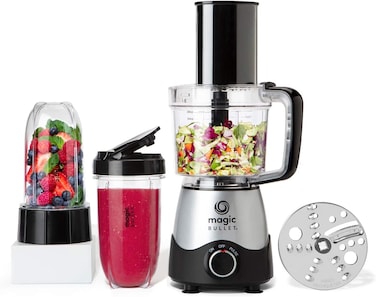 Small Size, Epic Results. Who knew one machine could do so much in so little time? One base with two attachments easily switches from mini food processor to blender in seconds. Blend, chop, mix, slice, shred and more! Get a handle on meal prep, whip up a fresh sck, or blend up a quick smoothie - however you spin it, you're in for a treat. Designed for everyday use, the Magic Bullet Kitchen Express is compact and countertop friendly - plus, its components are top rack dishwasher safe, keeping cleanup to a minimum. Slice everything for a fresh salad, potatoes for home-made oven cooked crisps or even all the trimmings for the perfect burger. Shred carrots for salads, courgette for a low-carb spaghetti altertive or even cabbage for homemade coleslaw. Chop garlic, onions and vegetables for all kinds of cooking or make a fresh chunky salsa without the mess. Whip up homemade baby food, creamy soups, or homemade houmous in seconds. Blend silky smooth nutritious smoothies and protein shakes. And with the handy To-Go Lid you can take your drink wherever you go. Grind coffee beans a deliciously fresh brew. Product Details: Power: 250W Speed: 10,000 RPM Dishwasher safe everything except power base. BPA free What’s Included 250W Motor Base 830ml Work Bowl with Feed Chute Food Pusher Stacked Chopping Blade Reversible Slice/Shred Disc Cross Blade 2 x Tall Cups To-Go Lid User Guide