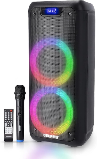 Geepas Rechargeable Professional Speaker, 40000W Pmpo, GMS11168, TWS Connection, BT/FM/USB/TF Card, LED Display, Wireless Microphone, 7.4V, 3000mAh Lithium Battery