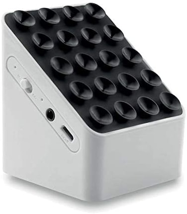 - 2.1 Bluetooth speaker and smartphone holder (&MOBILE ONLY TO SHOW HOW TO USE)With suction cups on the top.&Rechargeable Lithium 400mAh battery.&Output data: 3W and 4 Ohm.Dimensions: 5.8X5.8X6.8 CMNet Weight: 0.17 kg
