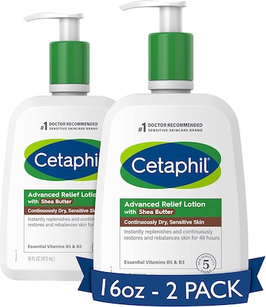 CETAPHIL Advanced Relief Lotion is formulated with nine moisturizing ingredients, including shea butter, to replenish and restore continuously dry skin. And now formulated with a new blend of key ingredients: hydrating glycerin, panthenol (vitamin B5) to hydrate, soothe and preserve the skin barrier, and niacinamide (vitamin B3) to help smooth skin texture and retain skin moisture barrier. This rich lotion immediately improves skin texture and luminosity, and provides long-lasting, 48-hour relief from dryness. Use daily to nourish dry skin and help restore skin natural barrier in just one week. Use with Advanced Relief Cream for continuous skin hydration and restoration of drier areas like hands, feet, knees and elbows. This unique formula is hypoallergenic, non-comedogenic (so it will not clog pores), fragrance and paraben free, and clinically proven to be gentle on all skin tones and types. Effectively defends against 5 signs of skin sensitivity.