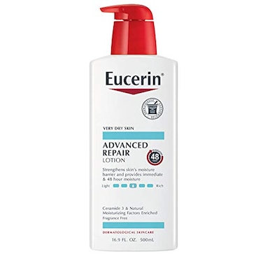 Eucerin advanced repair lotion is a breakthrough in repairing very dry skin and fighting dryness at its source. It provides 48 hour moisture, for skin that looks and feels healthy. This body lotion for dry skin is enriched with ceramides-3 and natural moisturizing factors. Ceramides help to strengthen the skin?s moisture barrier to lock in moisture. Natural moisturizing factors, amino acids that are naturally found in the skin, boost moisture and prevent dryness from reoccurring. Eucerin advanced repair body lotion is a lightweight and fast-absorbing formula that smoothes, repairs & hydrates dry skin. This body lotion is fragrance free, dye free, paraben free and is gentle enough for everyday use. To Use: Smooth over body daily. For best results, apply after showering. Pair with Eucerin Advanced Repair Cleanser for a full skin care regimen to give your skin the dermatological attention it needs.