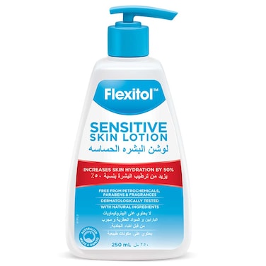 FLEXITOL SENSITIVE SKIN LOTION 250ml is formulated with naturally derived ingredients designed to deeply nourish and hydrate the skin. Ideal as an everyday moisturizer for dry, sensitive, rough, itchy or flaking skin as well as skin prone to eczema, psoriasis and dermatitis.