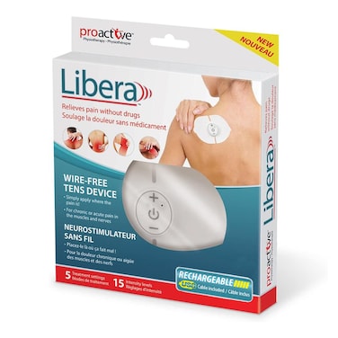 The Libera™ Tens Unit by ProActive™ is clinically proven to relieve pain without drugs. Tens devices rely on small electrical impulses delivered by electrodes that can be an effective way to manage pain. The Libera™ Tens Unit by ProActive™ is conveniently both wireless & rechargeable and the battery fully charges in just 2 hours. This Tens device allows you to relieve pain by stimulating or numbing the nerves and gives you the choice of 5 stimulation modes and 15 intensity levels. With only 3 buttons to operate this machine makes it simple and easy to use. The Libera™ helps relieve pain from: Arthritis, Sciatica, Neck & shoulder pain, Leg, knee & foot pain, Lower back pain, Carpal tunnel syndrome, Whiplash, Groin strain, Fibromyalgia, Plantar Fasciitis, Tennis & golfer's elbow, Diabetic neuropathy, Degenerative disk pain, and more! Package includes 1 Tens unit, USB cable, wall socket adapter, lithium polymer battery, set of gel pads, durable plastic carry case and illustrated instructions. The Libera™ Tens Unit by ProActive™s the drug-free way to relieve your pain.