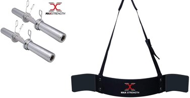 • <p>ARM BLASTER TARGET AND ISOLATE BICEP MUSCLES: Designed to enhance your barbell and dumbbell curls this arm curl blaster helps create stronger, more well-defined bicep muscles by locking elbows into place and keeping them from swaying during lifts.<p>ARM BLASTER STRENGTHEN ARMS, SHOULDERS, AND BACK: This bicep curl blaster is ideal for body builders, weightlifters, or even CrossFit athletes who want to get stronger arms, biceps, and shoulders which creates strength gains for other common movements<p>MAXSTRENGTH Made of Chrome Olympic dumbells bar<p>knurled handles for better grip.<p>Ideal for use with Olympic Disc Weights.<p>Max Strength Great Combination of Chrome Olympic Dumbbell Bar Gym Workout Weightlifting Bars Dumbell 1 Pair With Spring Locks Plus Weightlifting Arm Blaster Adjustable Bodybuilding Bomber Bicep