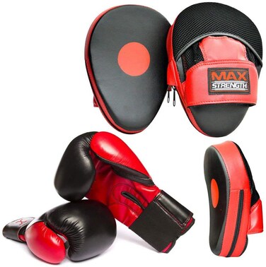 - <p>Made of High Quality Rex Leather, V-Shape Hook and Jab Sparring Pads Pair, High Quality Thick Shock Absorption Padding..<p>Open gloves style easy to put on/off, Perfect for boxing, kickboxing, martial art professionals and trainers, Comfortable Wrist Grip.<p>White target printed for accurate aim, Comes in Red/Black color combination., Comes as Pair.<p>Rex leather boxing and sparring gloves comes in Red/Black color combination, Target feature helps your aim and focus to enhance hand eye co-ordination, High density foam layering for maximum shock absorption, Air vent on palm to reduce sweat.<p>Comes in 10oz and 12oz size, Fit for adults, Great for boxing training or sparring purposes, Longer wrist strap to provide better wrist protection, Extra padding on wrist to reduce chances of Hand Injury.<p>Focus Pads: The Maxstrength World-Class Rex-Leather Curved Focus Pads are made with a strong attention to details.These Focus Pads are a great training partner for Sparring and Martial Arts Training. Our Focus Pads are designed to improve accuracy and Hand to Eye coordination. They are designed to be stable and resilient.The gloves are suitable to be used for any combat sports. They are designed with multi layers of high-density foam and integration of gel padding in machine mold for maximum shock absorption. Specially designed air vents on the palm keeps the inside of the palm cool and fresh at all times and even when used for longer periods. Contrast Heavy and secure double stitching for durability and long lasting. Extended Padding on the Wrist provides all round wrist protection and reduces the risk of injury to the wrist. All-purpose fitness gloves are perfect for light to moderate bag and pad work.